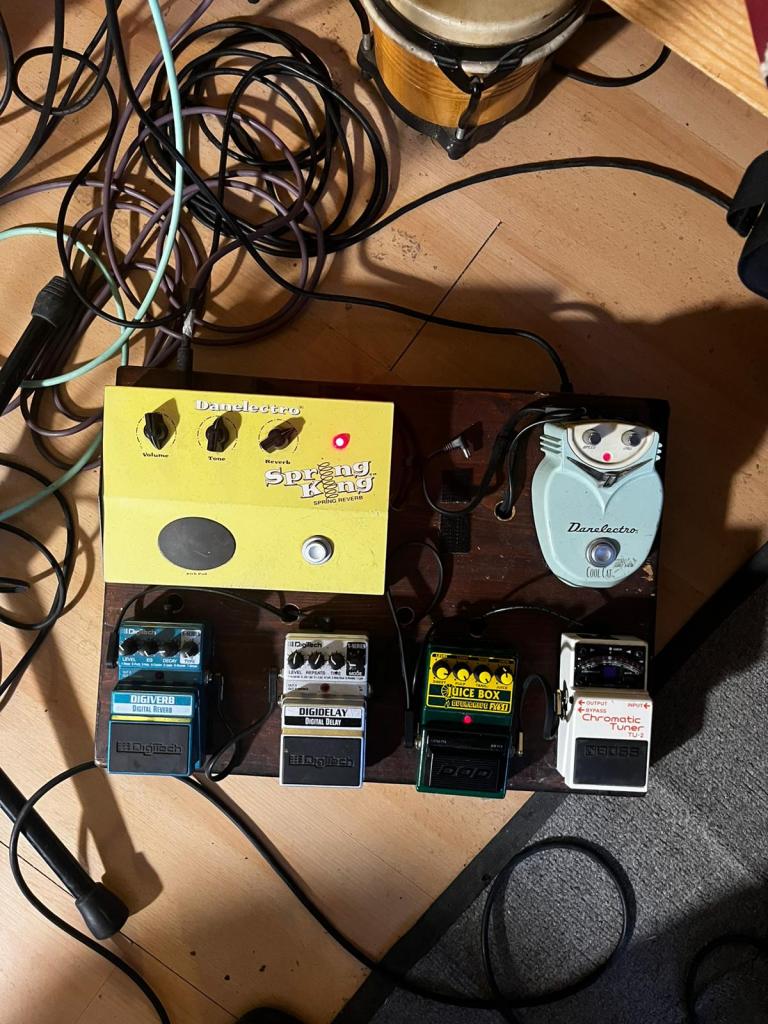 «Il Cool Cat della Danelectro, quello azzurrino. È un chorus come tutti gli altri, però più bellino da vedere (ride). Poi un DOD Juice Box, che è un overdrive. Un riverbero Spring King, sempre Danelectro. E un Canyon delay & looper della Electro Harmonix, che userò dal vivo quando suono la chitarra: mi alternerò infatti tra questi due strumenti».